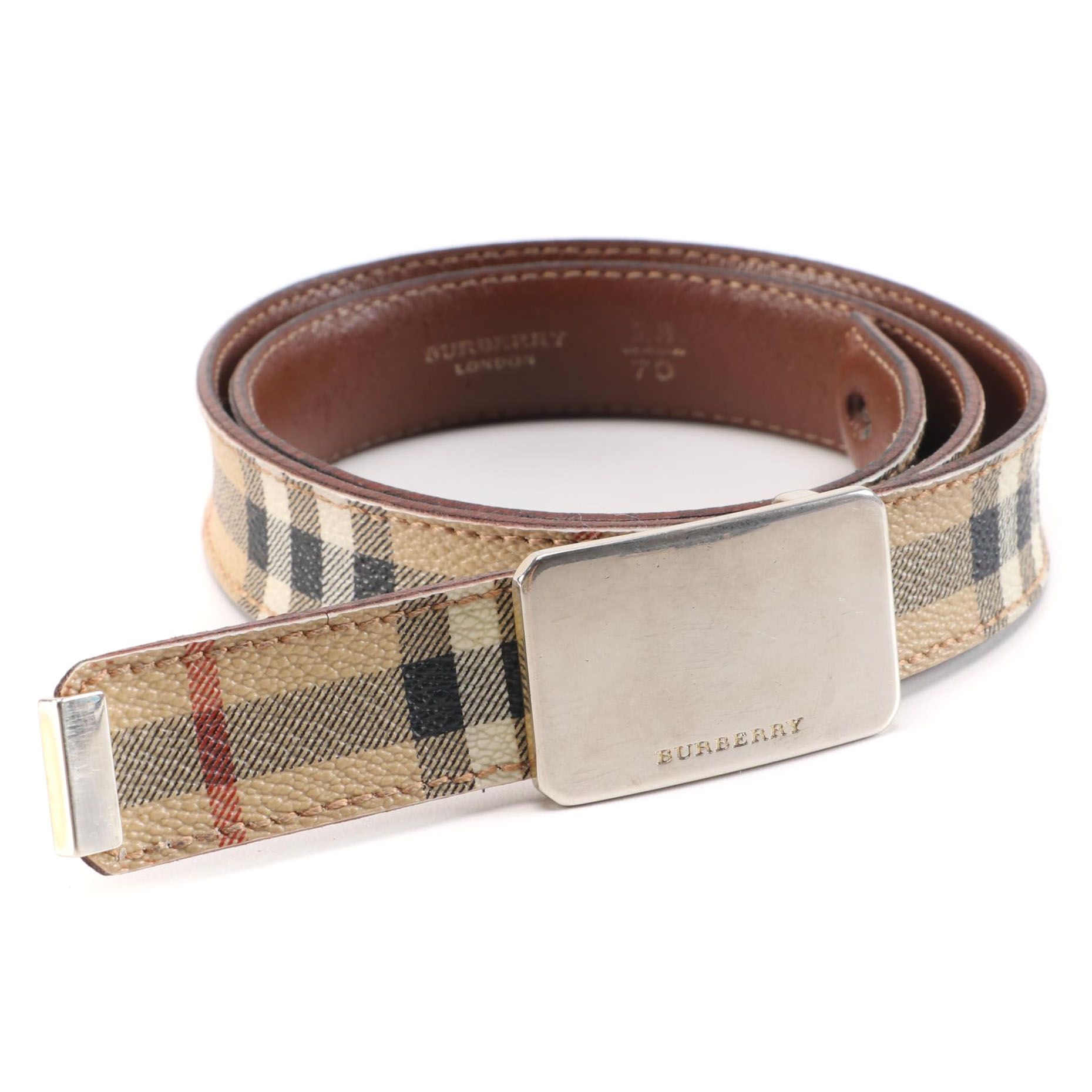 Genuine Burberry Haymarket Check Leather Belt Brass Plaque